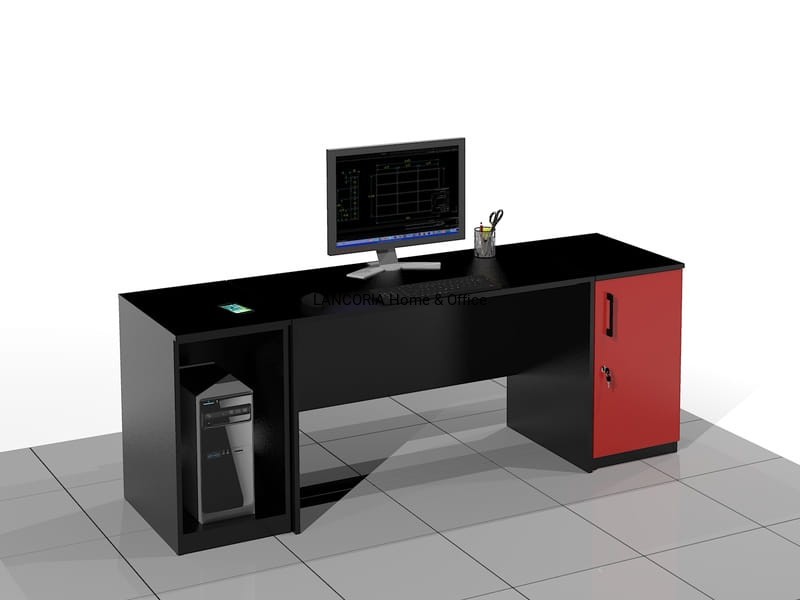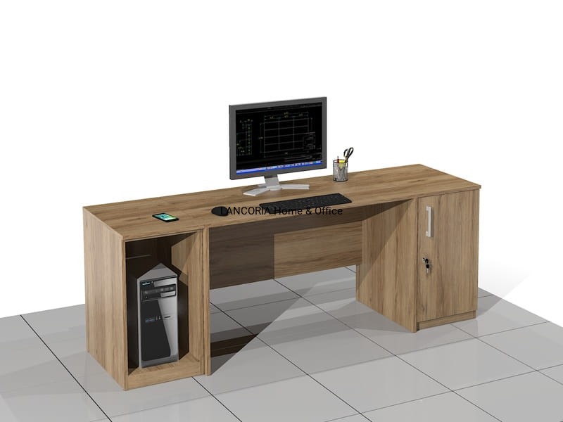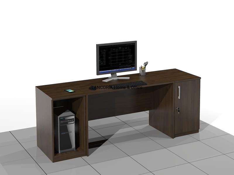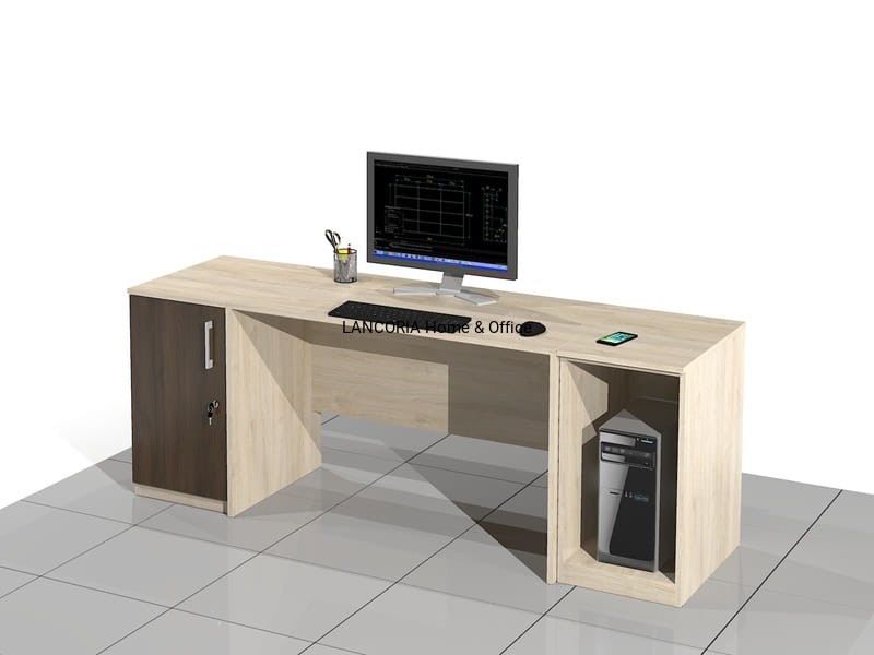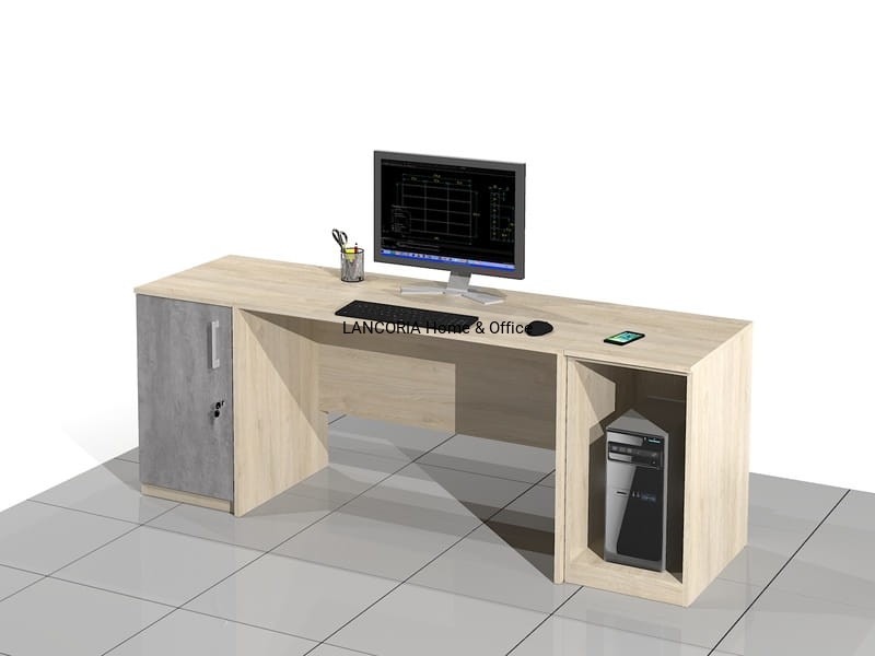 Zestaw trzech elementów tworzących biurko z dostawkami. Eleganckie biurka o solidnej i mocnej konstrukcji. Szafka z drzwiami i szafka z wnęką na komputer.