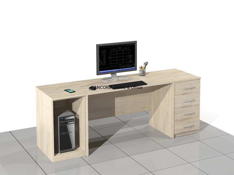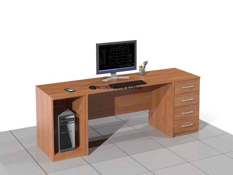 Zestaw trzech elementów tworzących biurko z dostawkami. Eleganckie biurka o solidnej i mocnej konstrukcji. Szafka z czterema szufladami i szafka z wnęką na komputer.