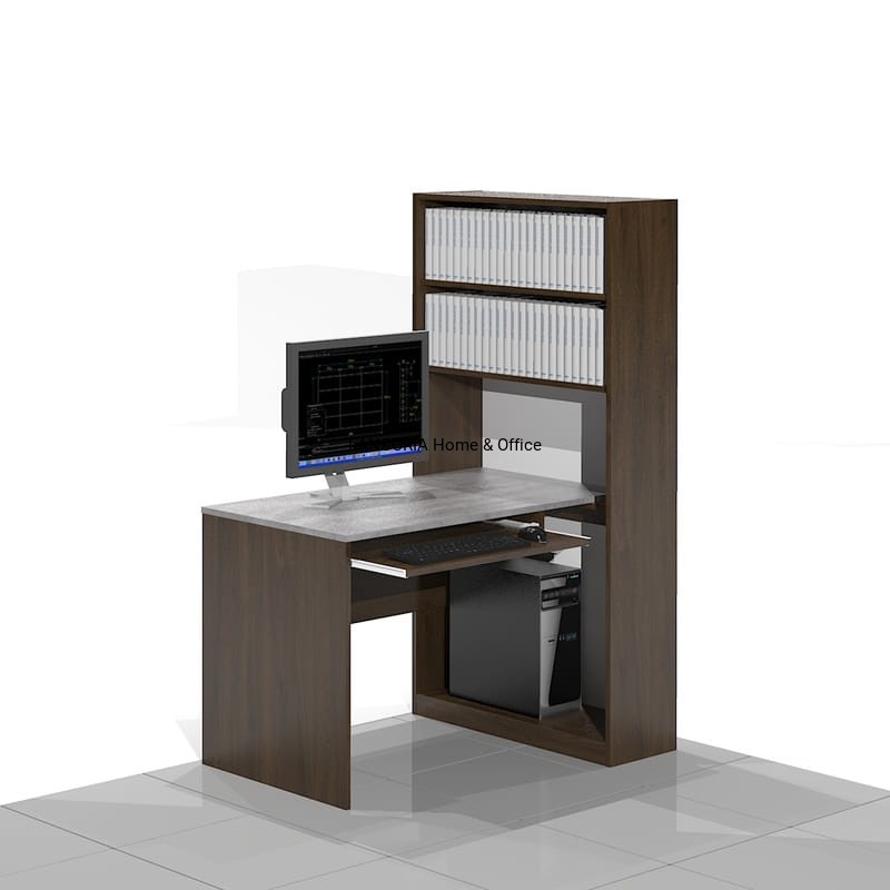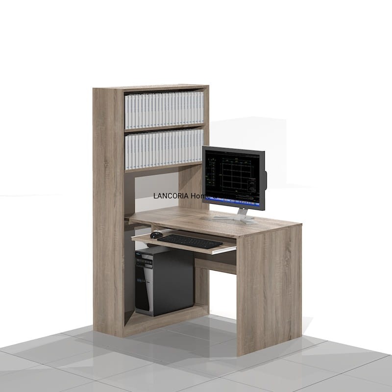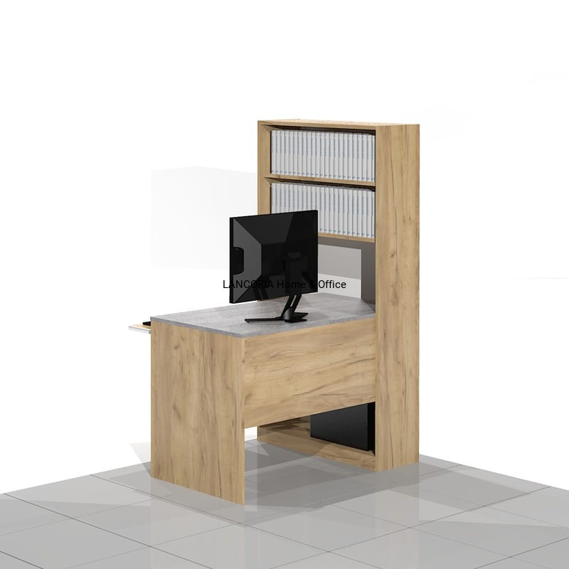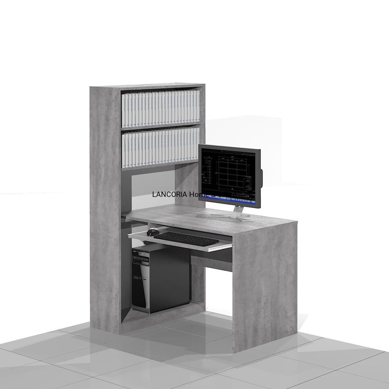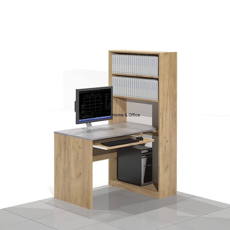 Eleganckie biurko komputerowe o solidnej i mocnej konstrukcji. Z boku regał z półkami i miejscem na komputer stacjonarny.