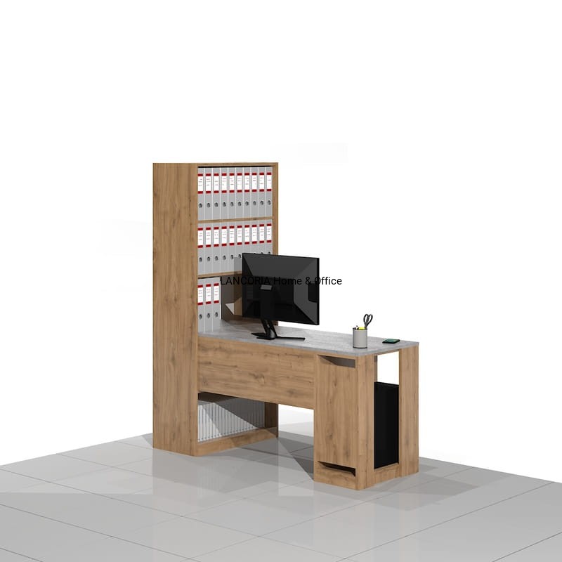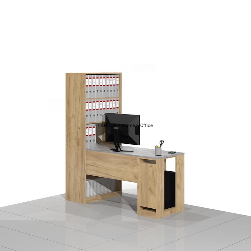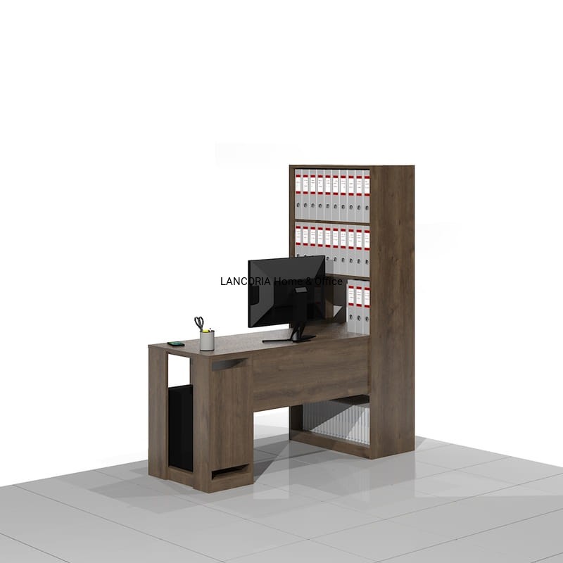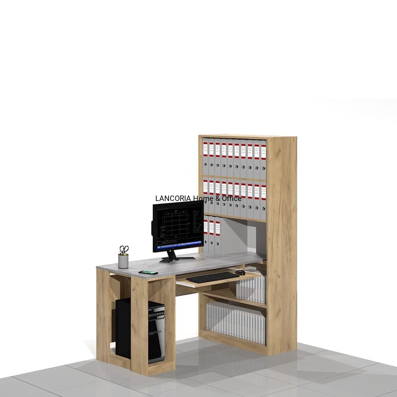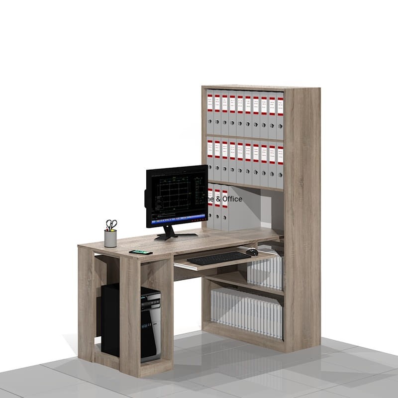 Eleganckie biurko komputerowe o solidnej i mocnej konstrukcji z dostawką na komputer stacjonarny. Z boku regał biurowy z półkami na segregatory ponad blatem i książki pod blatem.