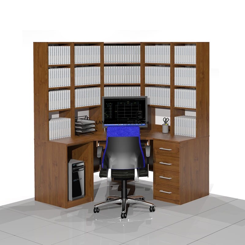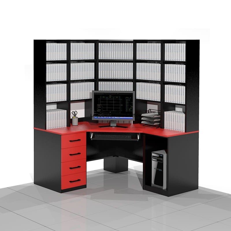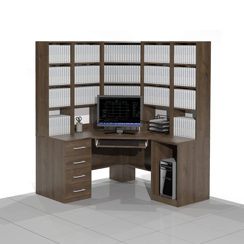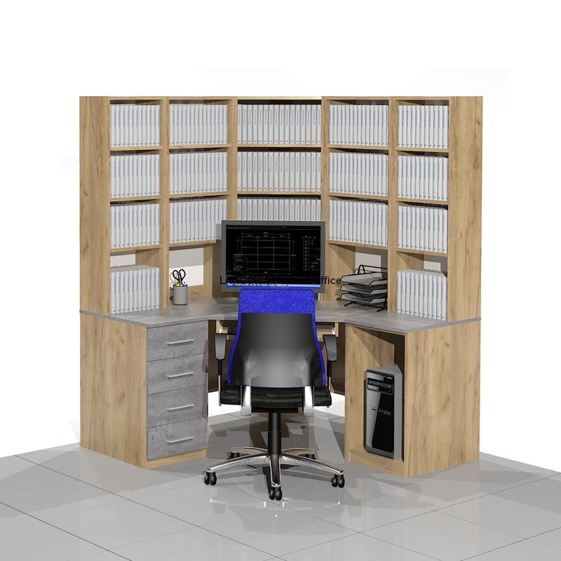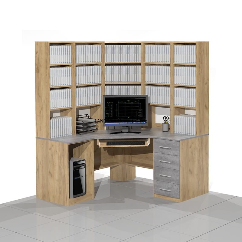 Eleganckie biurko komputerowe narożne z regałami w formie nadstawki. Z boku dostawka na komputer stacjonarny i dostawka z czterema szufladami. Dostawki są wolnostojące z osobnymi blatami. Mocna i solidna konstrukcja.