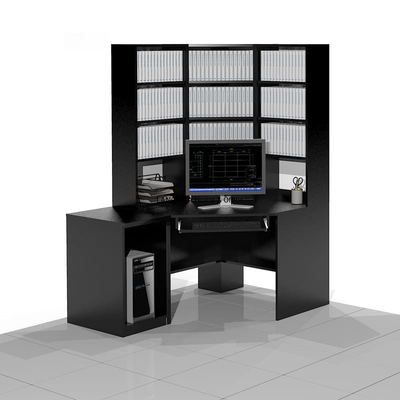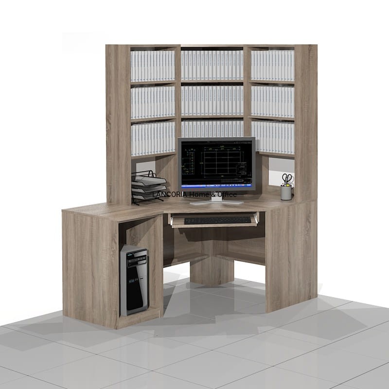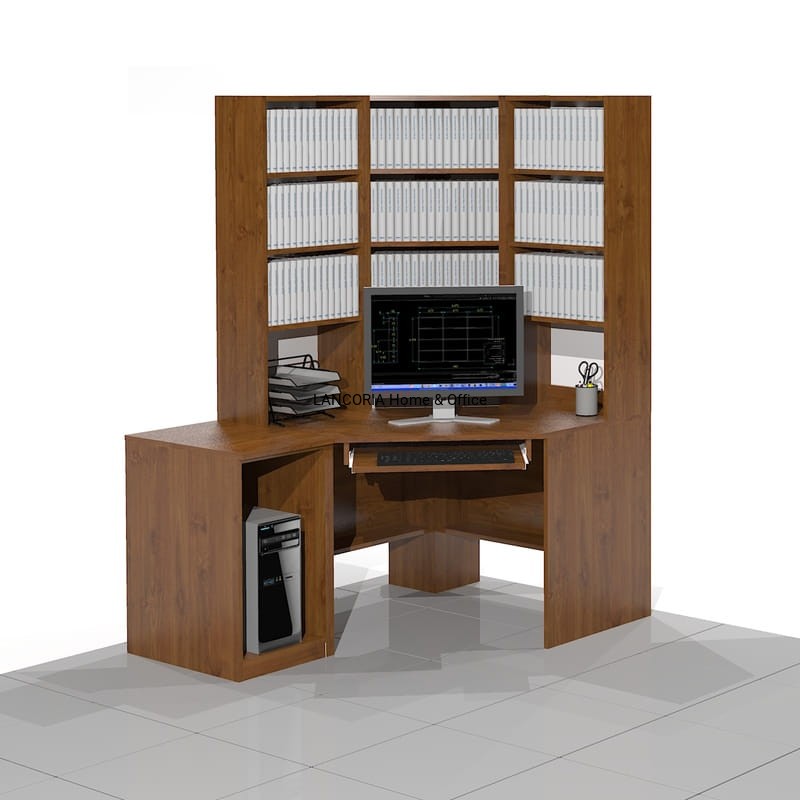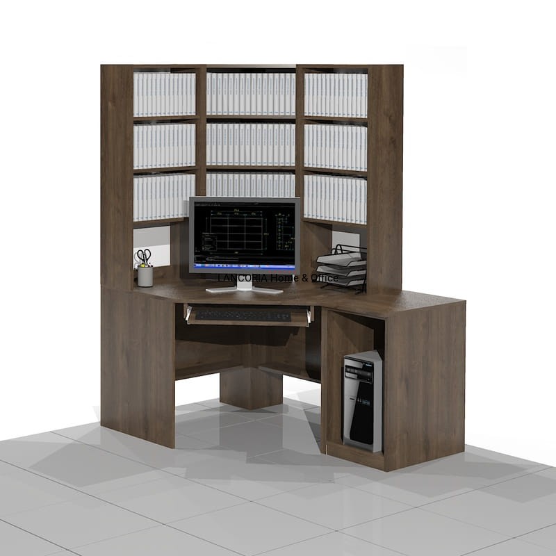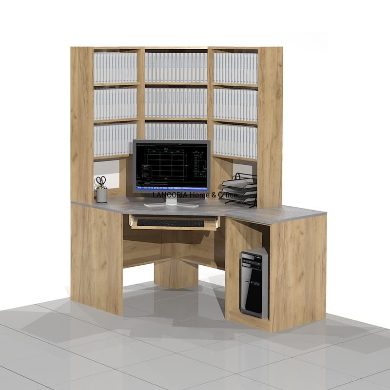 Eleganckie biurko komputerowe narożne z regałami w formie nadstawki. Z boku dostawka na komputer stacjonarny. Dostawka jest wolnostojąca z osobnym blatem. Mocna i solidna konstrukcja.