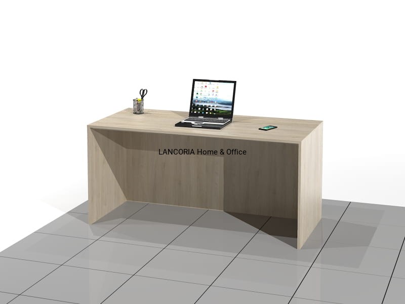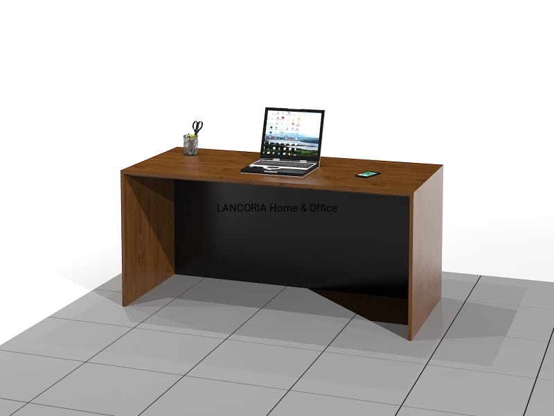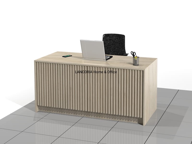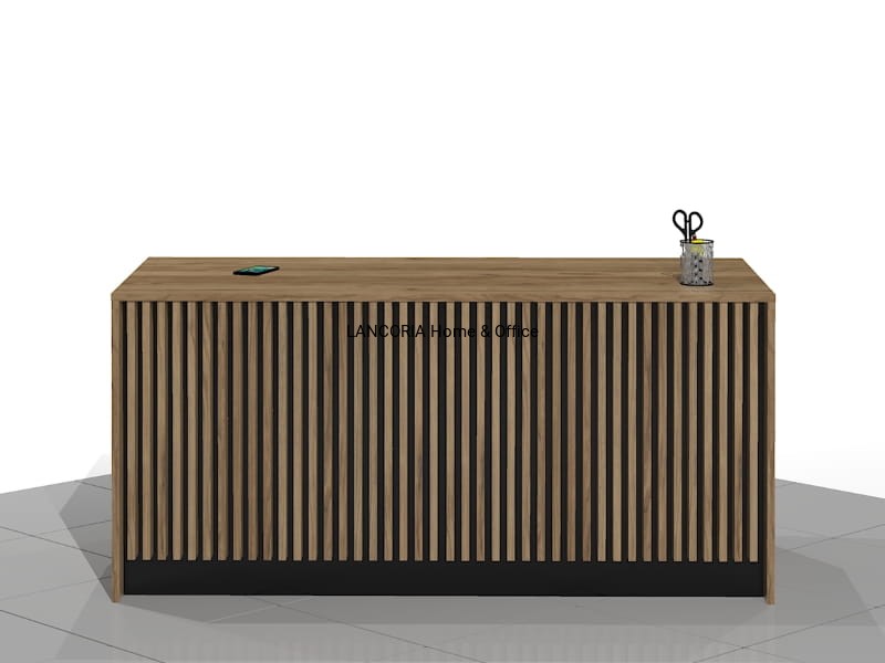 Eleganckie biurko recepcyjne o solidnej i mocnej konstrukcji. Biurko bez szafek - można wykorzystać wolną przestrzeń lub dokupić pomocniki biurowe.