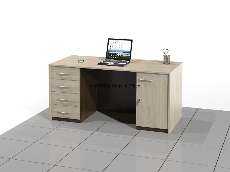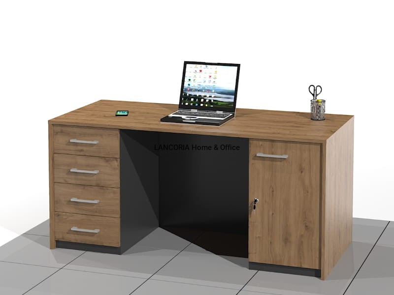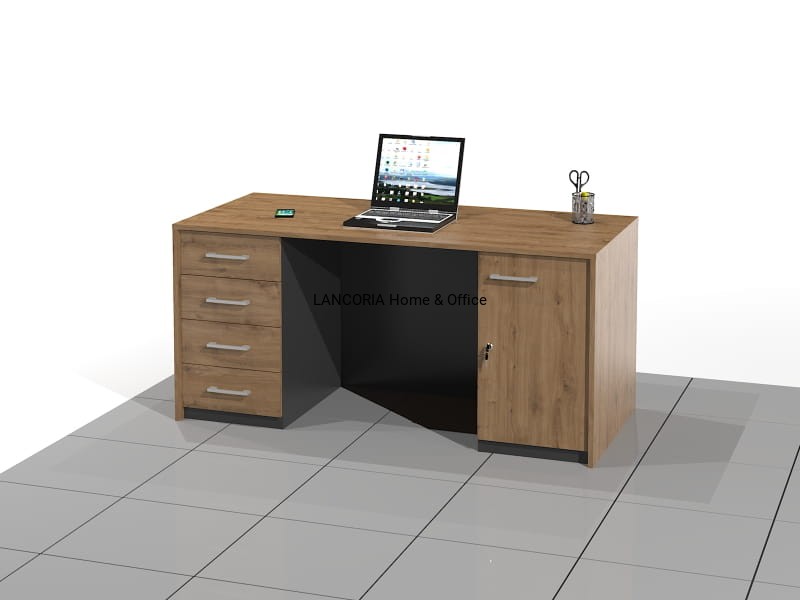 Eleganckie biurko recepcyjne o solidnej i mocnej konstrukcji. Biurko posiada szafkę z drzwiami i szafkę z czterema szufladami z pełnym wysuwem.