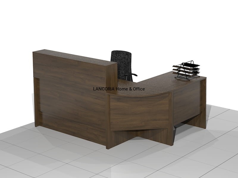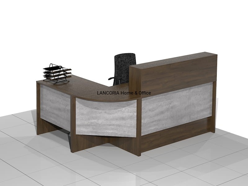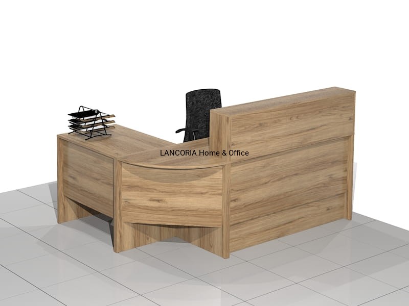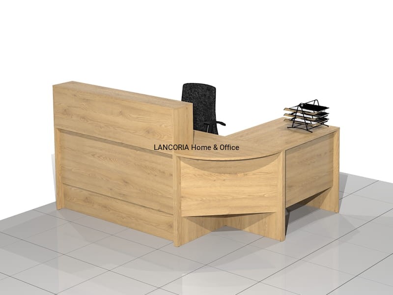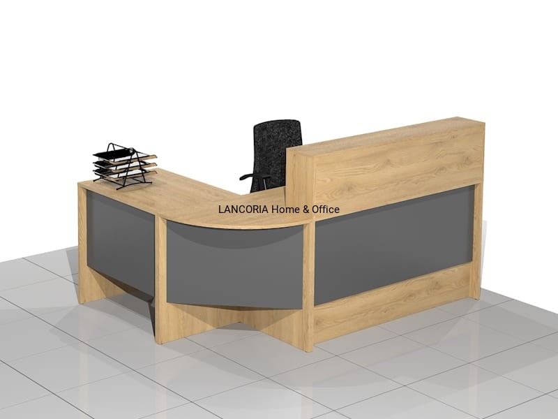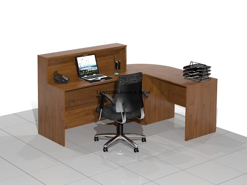 Zestaw czterech elementów tworzących biurko recepcyjne narożne z nadstawką. Eleganckie biurka o solidnej i mocnej konstrukcji. Wersja prawa lub lewa.