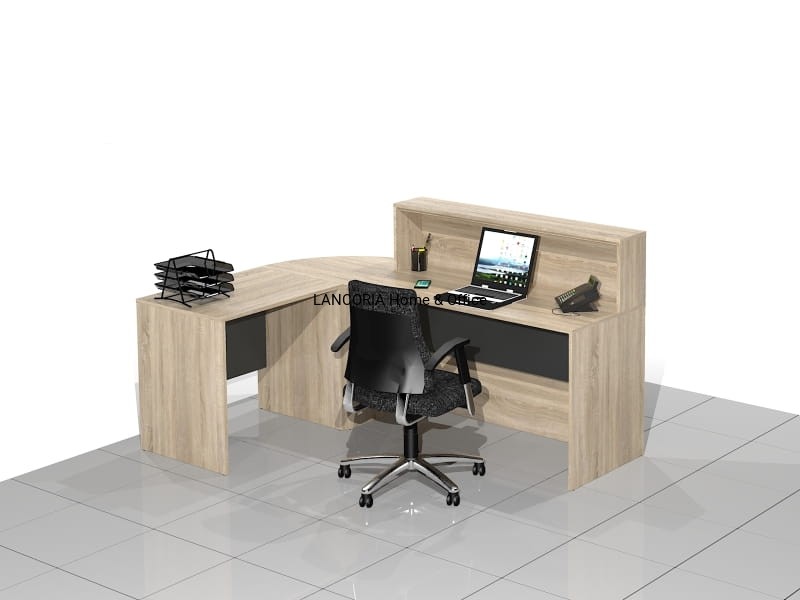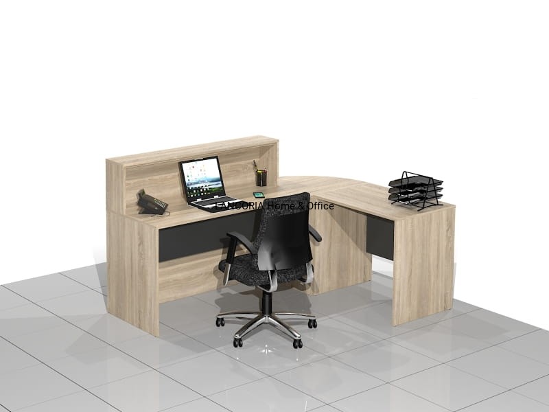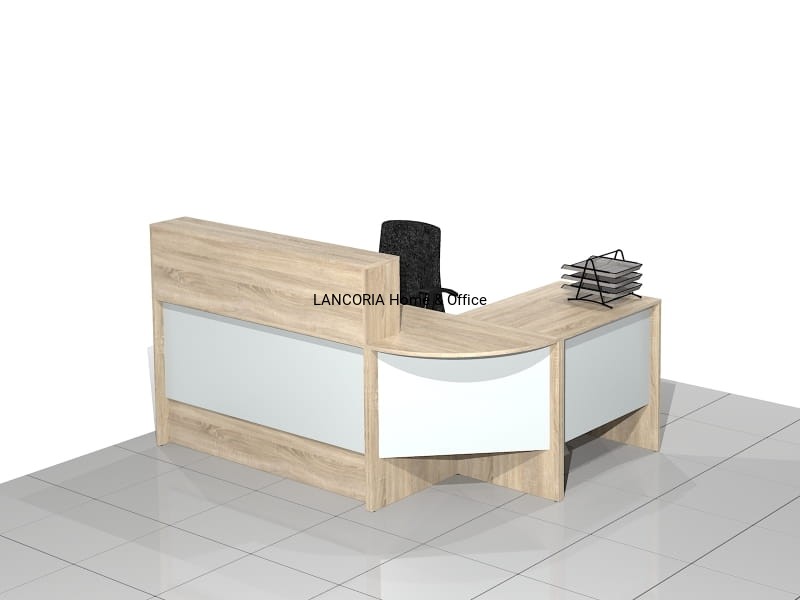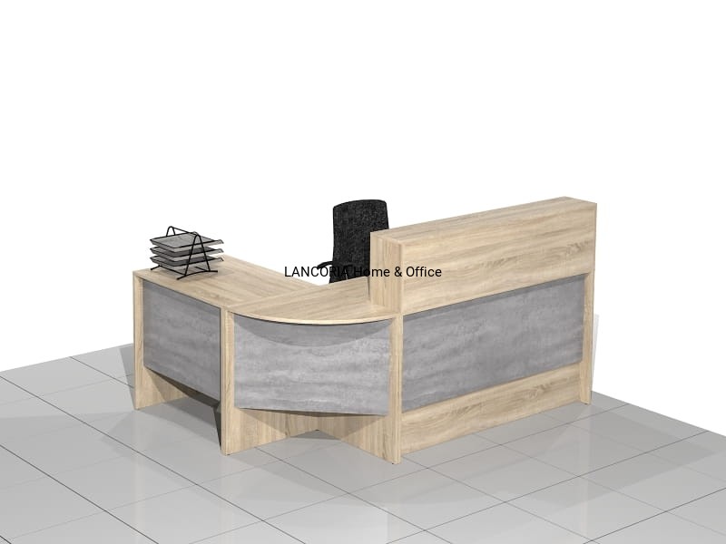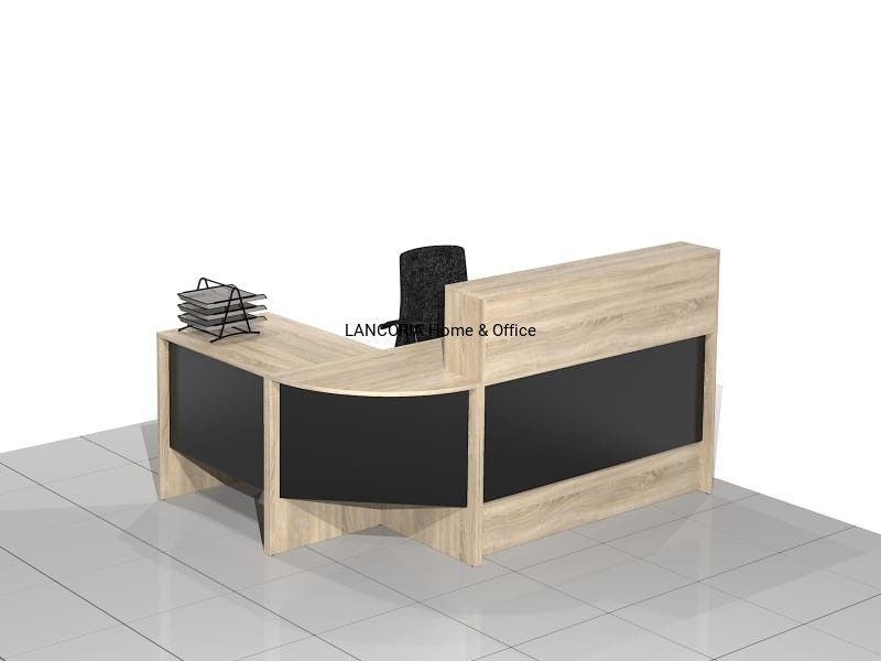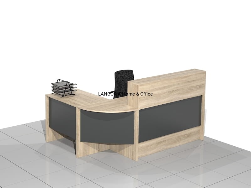Zestaw czterech elementów tworzących biurko recepcyjne narożne z nadstawką. Eleganckie biurka o solidnej i mocnej konstrukcji. Wersja prawa lub lewa.