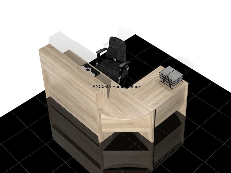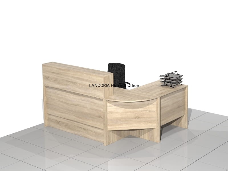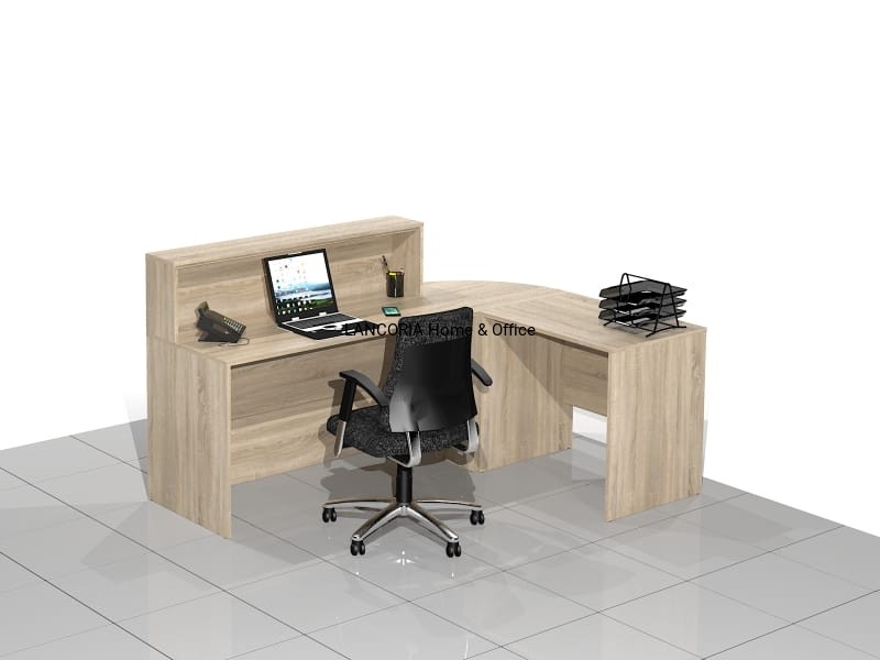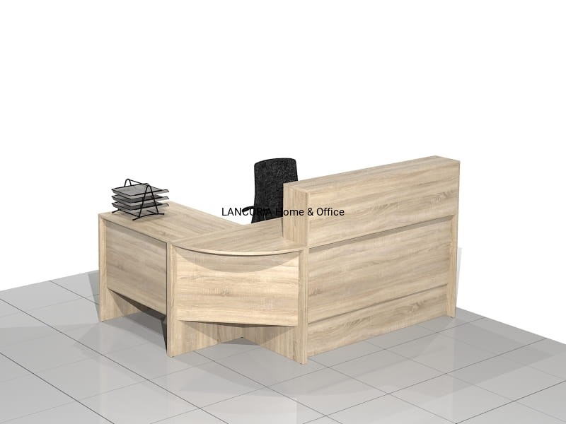 Zestaw czterech elementów tworzących biurko recepcyjne narożne z nadstawką. Eleganckie biurka o solidnej i mocnej konstrukcji. Wersja prawa lub lewa.