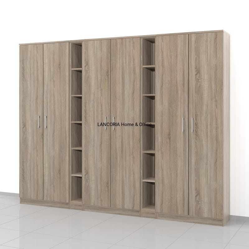 Szafa składa się z 5 modułów. Szafy o szerokości 80 cm i dwa wąskie regały o szerokości 20 cm każdy. W szafach i regałach jest 6 poziomów co 33 cm.