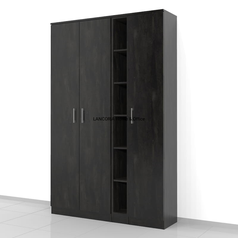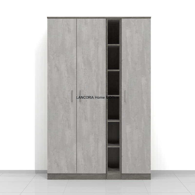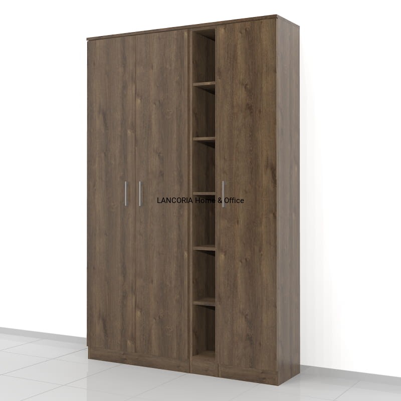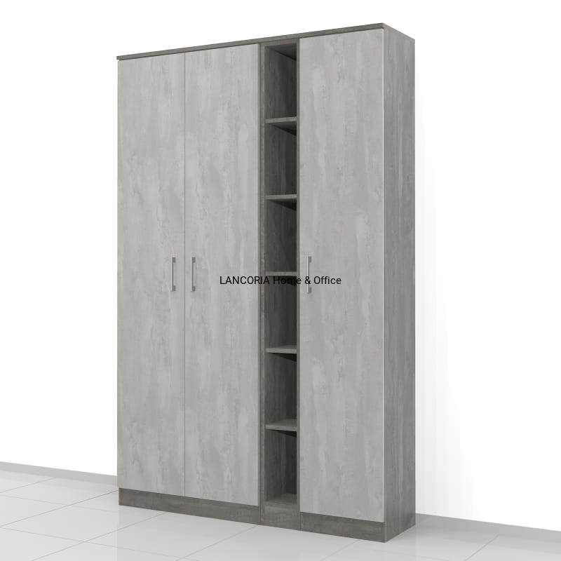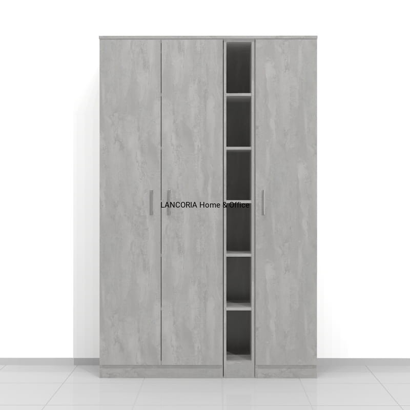 Szafa składa się z 3 modułów. Po lewej szafa o szerokości 80 cm, w środku jeden wąski regał o szerokości 20 cm i po prawej szafa o szerokości 40 cm. W szafach i regałach jest 6 poziomów co 33 cm.