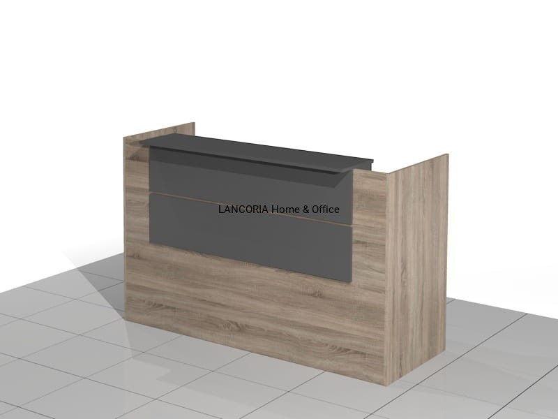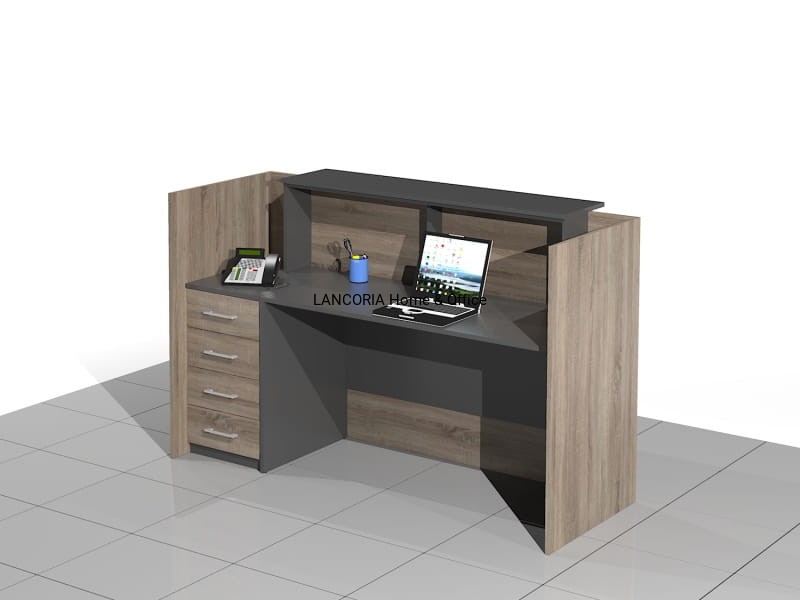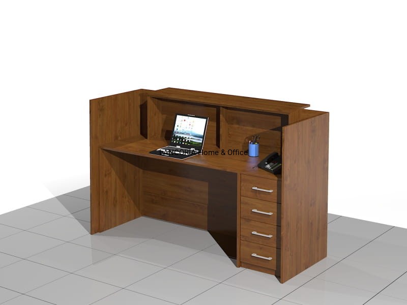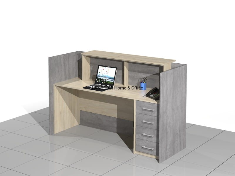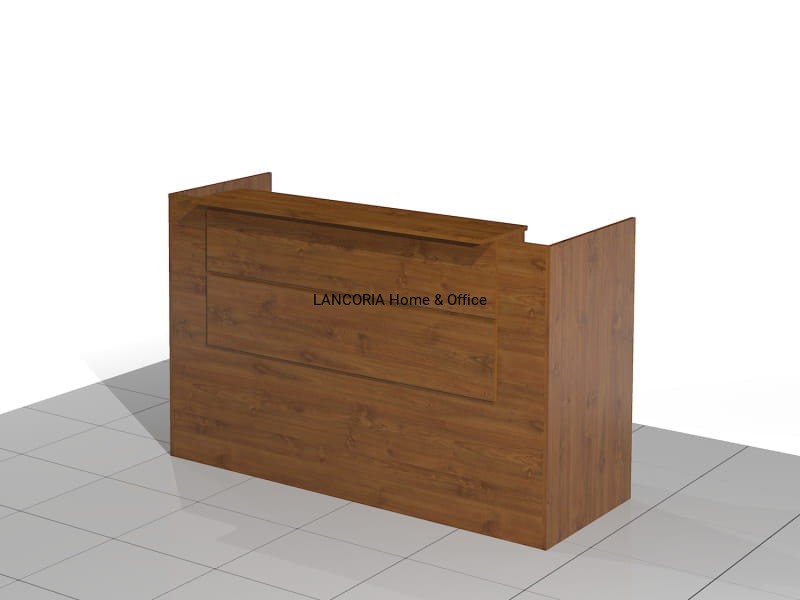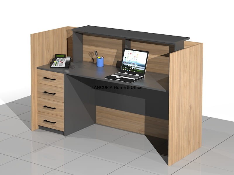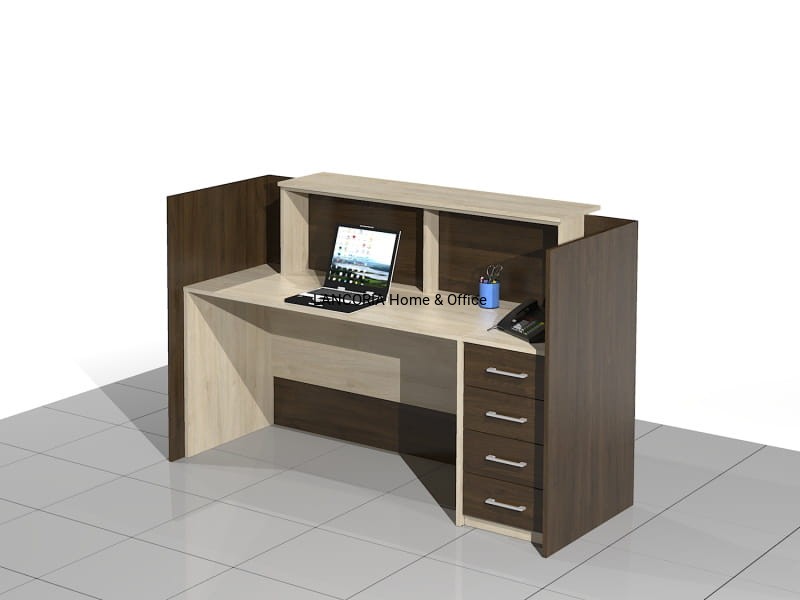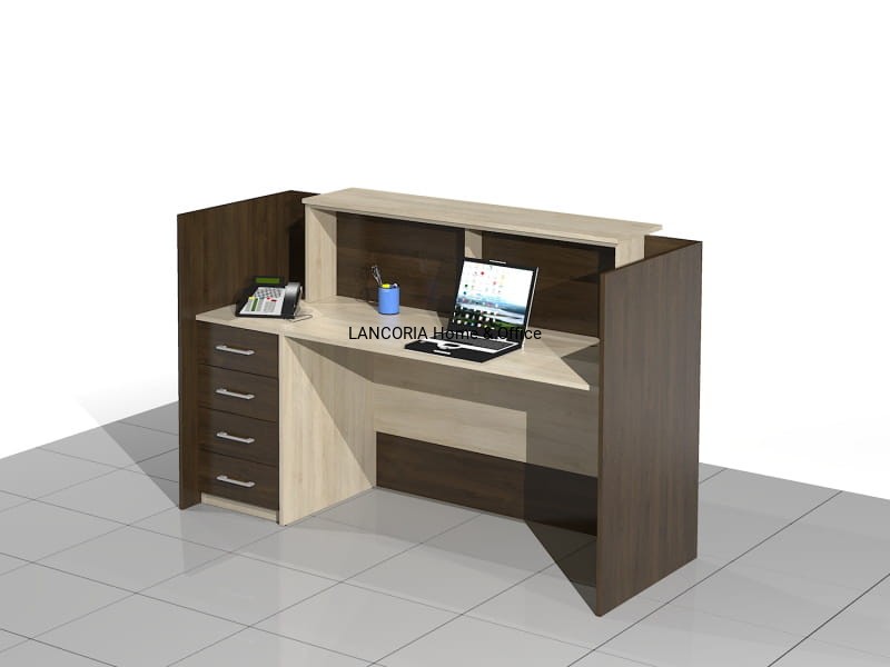 Elegancka lada recepcyjna o solidnej i mocnej konstrukcji. Zabudowany front z blatem górnym, pod którym są dwie poziome blendy. Część roboczą stanowi duże biurko płytowe i dostawka - szafka z szufladami.