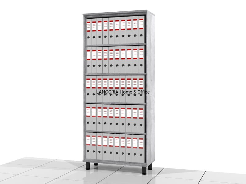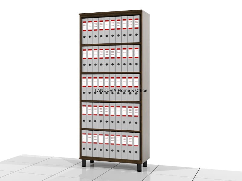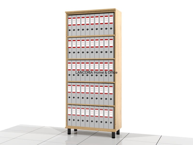 Wysoki regał biurowy otwarty na metalowych nóżkach o wysokości 10 cm. Regały o mocnej konstrukcji i eleganckim wyglądzie.