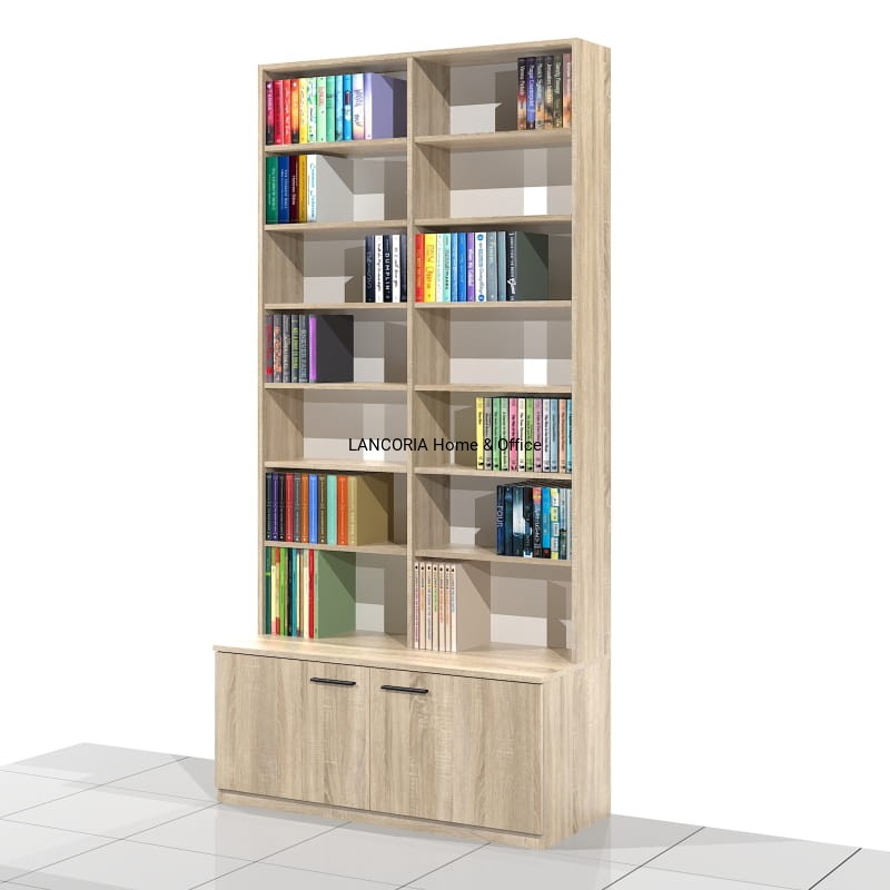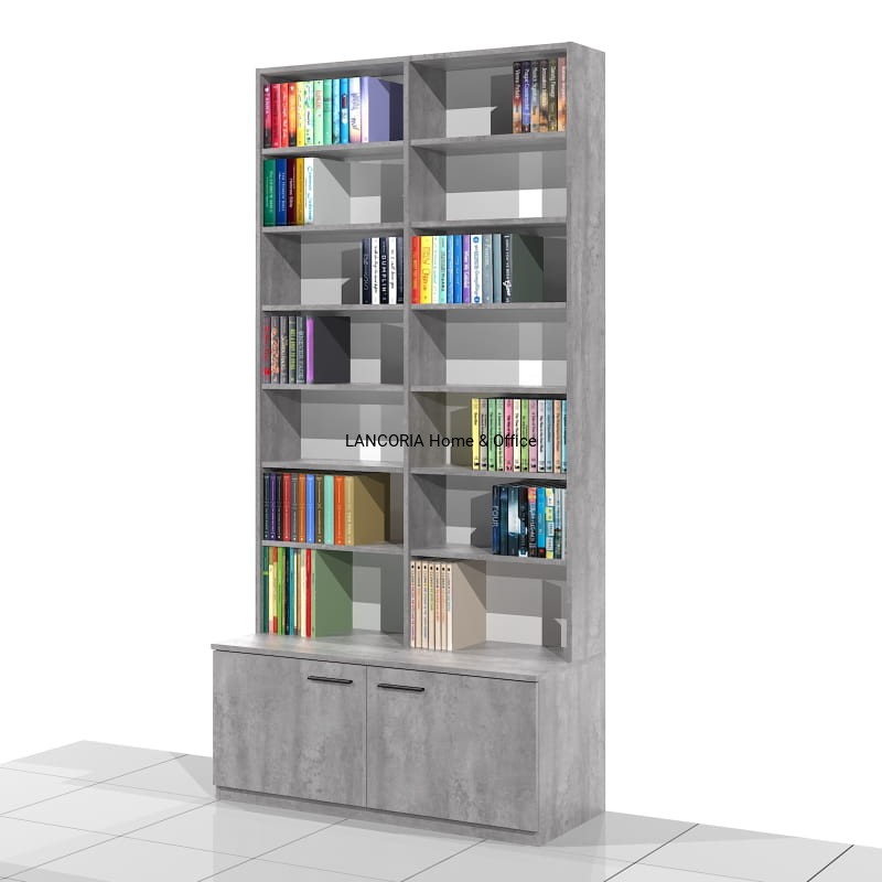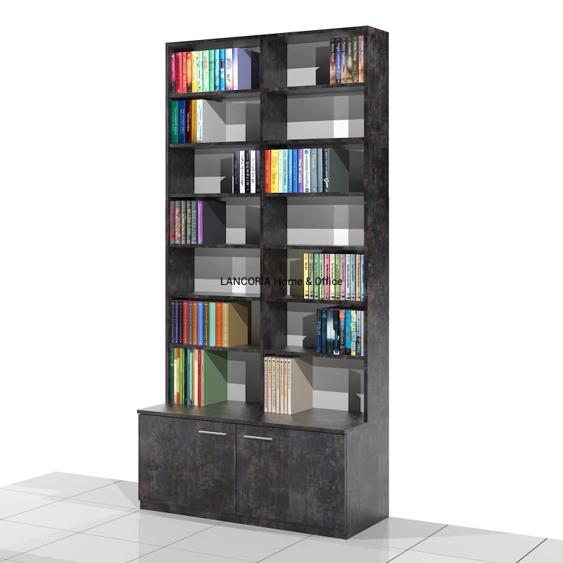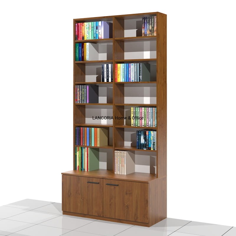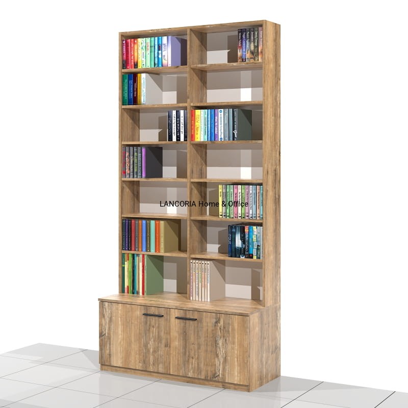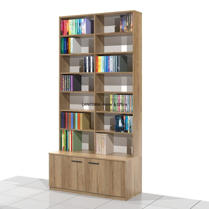 Elegancki regał książkowy o solidnej i mocnej konstrukcji. Posiada siedem poziomów na książki oraz szafkę z drzwiami.