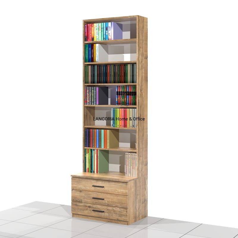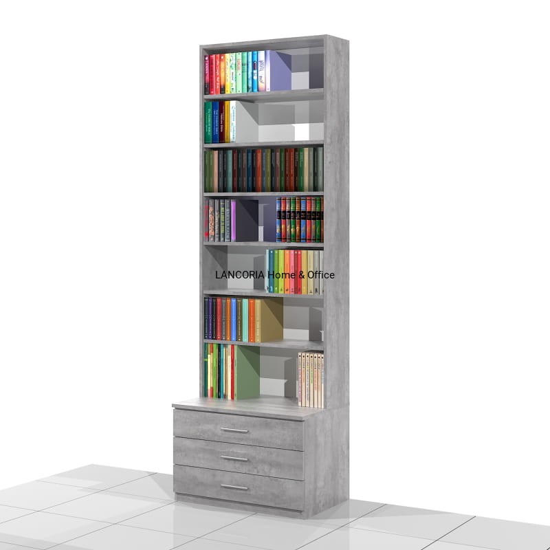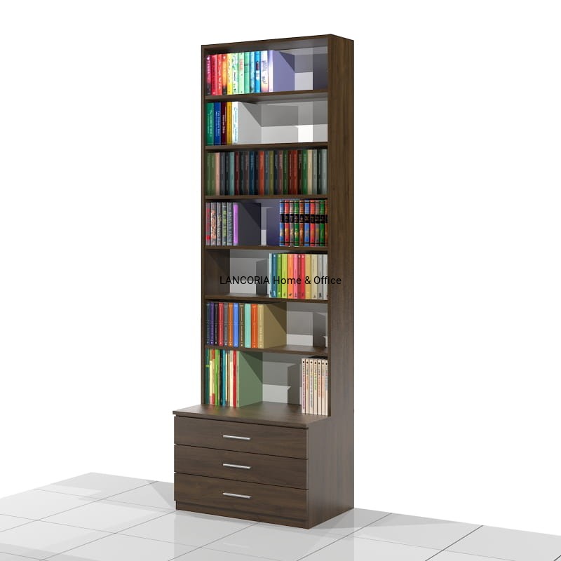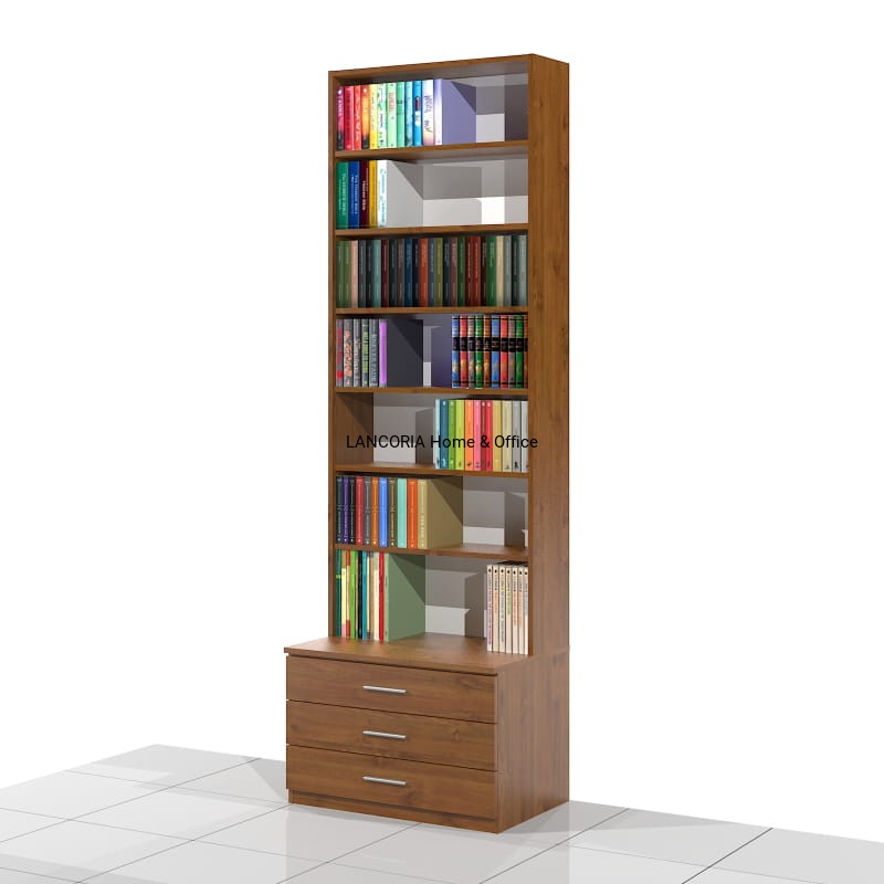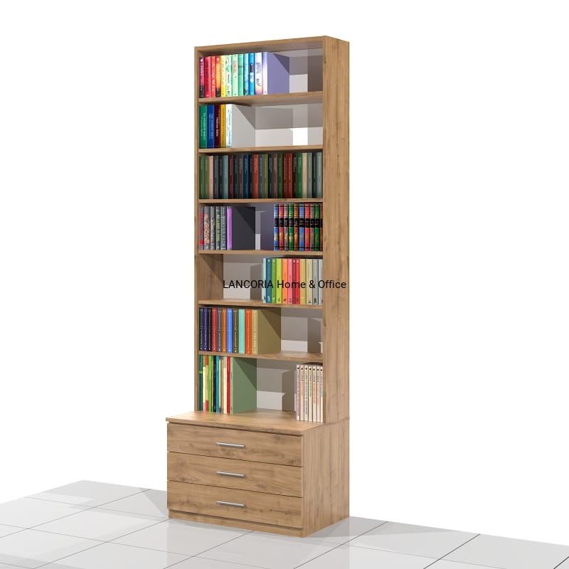 Elegancki regał książkowy o solidnej i mocnej konstrukcji. Posiada siedem poziomów na książki oraz szafkę z trzema szufladami.