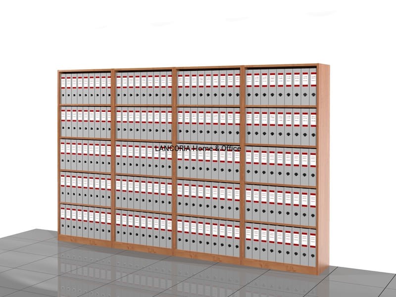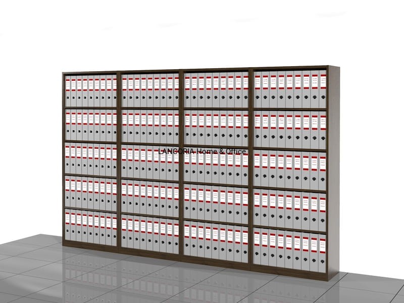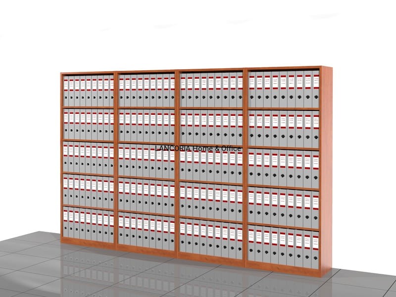 Cztery regały biurowe o solidnej i mocnej konstrukcji. Pięć poziomów na segregatory.