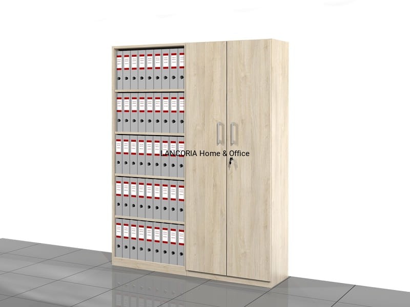 Regał otwarty i szafa biurowa zamykana o solidnej i mocnej konstrukcji. Pięć poziomów na segregatory. Dostarczane w całości zmontowane.
