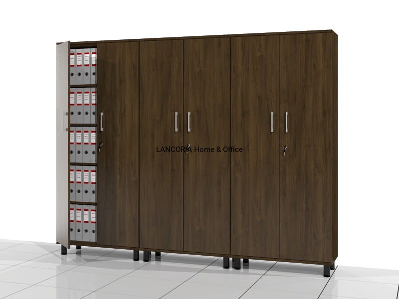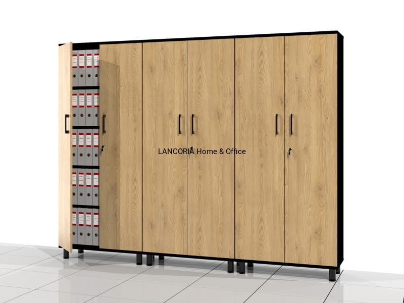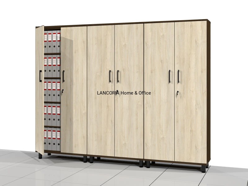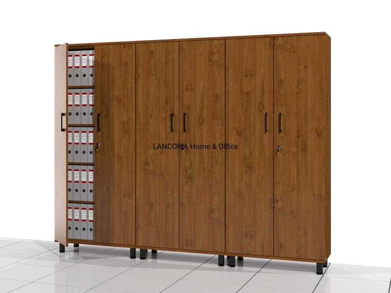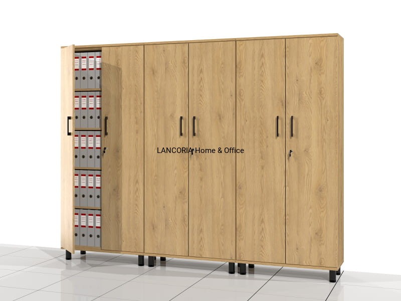 Pięć poziomów na segregator biurowy. Całość za drzwiami zamykanymi na zamek meblowy.
